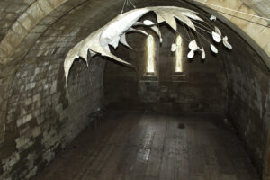 Il nous fait visiter la grande pièce voûtée du rez-de-chaussée, encore bien conservée, de style cistercien par la pureté des lignes. C’est là qu’étaient stockés céréales et olives, sans doute aussi des fûts de vin, aux XIIe-XIIIe s., pour le compte de l’abbaye des Chambons.