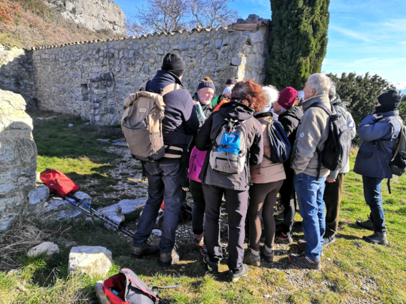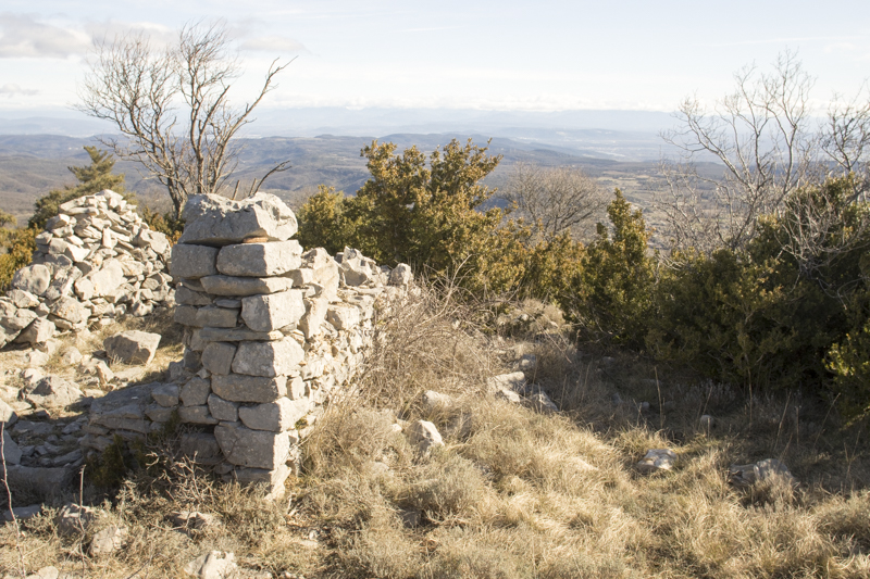 La montée au sommet se fait par un sentier escarpé sur la fin. De là, on gagne la table d’orientation, d’où l’on jouit d’une magnifique vue panoramique sur toute tout le plateau de Gras et du Laoul, la vallée du Rhône et les Préalpes, le Ventoux en fond. C’est l‘occasion de rappeler les grandes étapes de l’histoire de cette partie sommitale de la Dent de Rez, surtout occupé à l’Age du Fer avec la présence d’une double enceinte en pierre sèche à l’ouest du côté le plus vulnérable. Au début du XXe s., la culture de la « fine » (lavandula vera) y semble importante comme nous le rappellent quelques clichés sur plaques photographiques. On poursuit par un petit détour à la triste ruine de l’oratoire à saint Isidore, patron des laboureurs, invoqué les années de sécheresse pour faire venir la pluie par les habitants de Gras. Aujourd’hui, l’ensemble du massif est une zone protégée faisant l’objet d’un arrêté préfectoral de protection de biotope. Un mot aussi sur l’ancienne mire tripode métallique, renversée en novembre 2011, à l’origine de toute une polémique locale. La descente se fait par un étroit sentier qui ramène sur la piste puis sur la route du hameau des Reynouard. Une reprise bien réussie, sur ce site emblématique et protégé de l’Ardèche, célèbre à bien des égards.