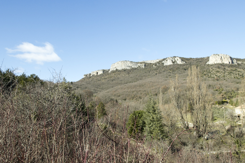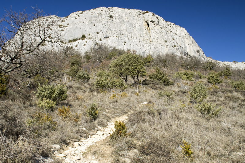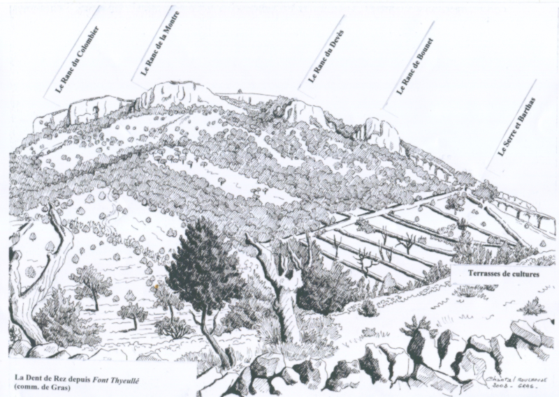 C’est l’occasion de constater l’importance des anciennes terrasses de culture sur tout ce secteur des Reynouard, avec d’énormes clapas d’épierrement. Plus à l’ouest, sur les pentes de Serre Bourret, les murs de soutènement en pierre sèche se cachent sous une végétation invasive. Les anciennes cartes postales sont d’excellents documents pour suivre cette déprise agricole. Face à nous, la muraille de la Dent de Rez avec ses quatre rancs, d’ouest en est : du Colombier, de la Montre, du Devès et de Bounet, chers à Chantal Rouchouse. Un court temps d’arrêt au Col d’Eyrole, qui fut une voie de passage entre la vallée du Rhône et les Cévennes.