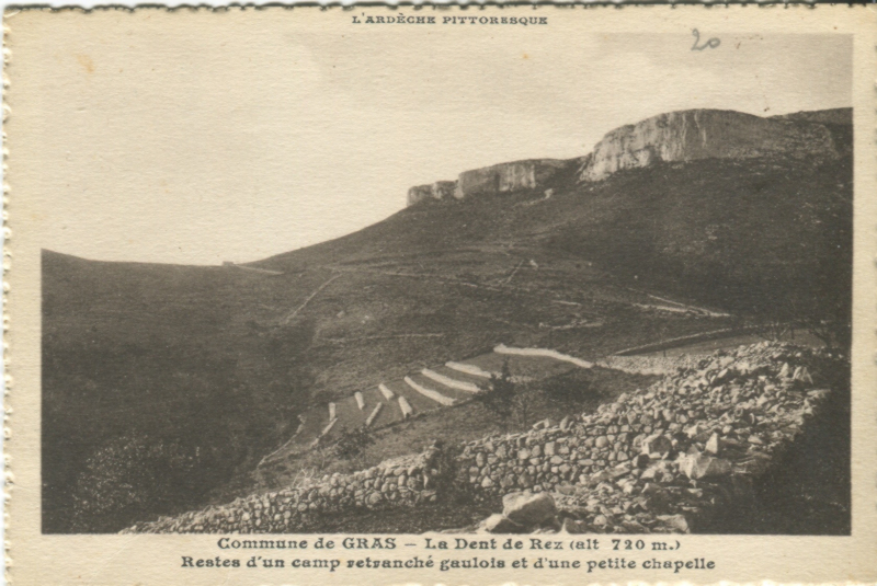 La montée au sommet se fait par un sentier escarpé sur la fin. De là, on gagne la table d’orientation, d’où l’on jouit d’une magnifique vue panoramique sur toute tout le plateau de Gras et du Laoul, la vallée du Rhône et les Préalpes, le Ventoux en fond. C’est l‘occasion de rappeler les grandes étapes de l’histoire de cette partie sommitale de la Dent de Rez, surtout occupé à l’Age du Fer avec la présence d’une double enceinte en pierre sèche à l’ouest du côté le plus vulnérable. Au début du XXe s., la culture de la « fine » (lavandula vera) y semble importante comme nous le rappellent quelques clichés sur plaques photographiques. On poursuit par un petit détour à la triste ruine de l’oratoire à saint Isidore, patron des laboureurs, invoqué les années de sécheresse pour faire venir la pluie par les habitants de Gras. Aujourd’hui, l’ensemble du massif est une zone protégée faisant l’objet d’un arrêté préfectoral de protection de biotope. Un mot aussi sur l’ancienne mire tripode métallique, renversée en novembre 2011, à l’origine de toute une polémique locale. La descente se fait par un étroit sentier qui ramène sur la piste puis sur la route du hameau des Reynouard. Une reprise bien réussie, sur ce site emblématique et protégé de l’Ardèche, célèbre à bien des égards.