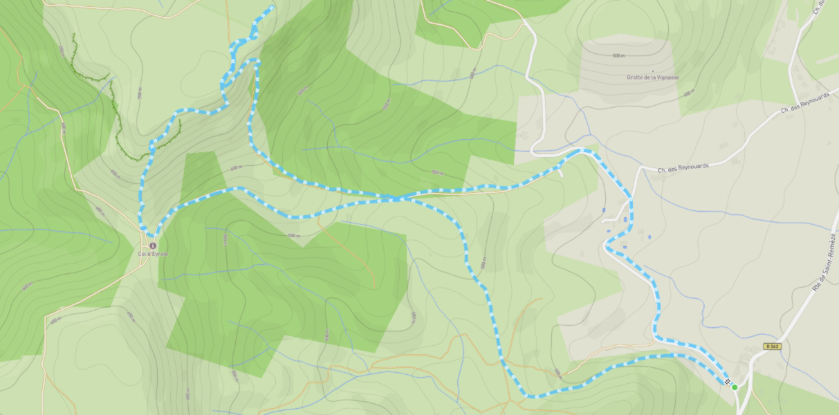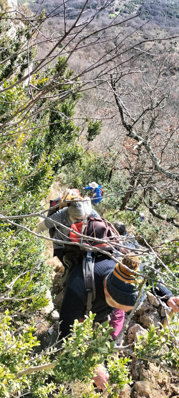 C’est l’occasion de constater l’importance des anciennes terrasses de culture sur tout ce secteur des Reynouard, avec d’énormes clapas d’épierrement. Plus à l’ouest, sur les pentes de Serre Bourret, les murs de soutènement en pierre sèche se cachent sous une végétation invasive. Les anciennes cartes postales sont d’excellents documents pour suivre cette déprise agricole. Face à nous, la muraille de la Dent de Rez avec ses quatre rancs, d’ouest en est : du Colombier, de la Montre, du Devès et de Bounet, chers à Chantal Rouchouse. Un court temps d’arrêt au Col d’Eyrole, qui fut une voie de passage entre la vallée du Rhône et les Cévennes.
