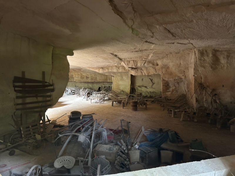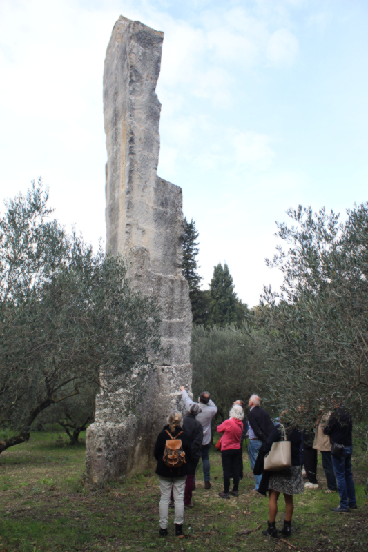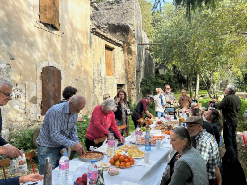 Puis, ce fut un moment particulièrement convivial au Mas de la Pyramide, une ancienne carrière romaine à ciel ouvert avec les restes d’un monolithe de plus de 22 m de haut qui témoigne du travail gigantesque réalisé ici. On y trouve aussi une incroyable ferme troglodytique et plusieurs immenses porches avec des collections de matériel agricole, encore occupés il y a quelques années par Lolo Mauron, un personnage haut en couleurs, qui a légué le tout à la Ville. La table avait été dressée devant cette bâtisse, où nous avons partagé le repas entre nos trois associations, même quatre puisque ce Mas de la Pyramide est aujourd’hui géré par une association de bénévoles pour en faire « un pôle de promotion de la culture et de la langue provençales ».